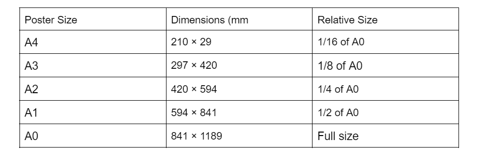 That means if you’re asking how big an A0 poster is, it will be double that of an A1 size and sixteen times larger than an A4 sheet of paper.